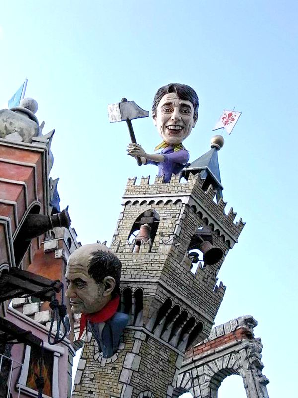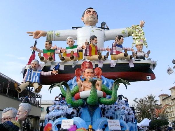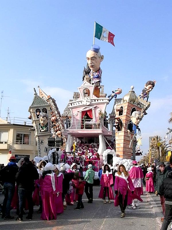 とにかく多かったのは「政治家や社会を皮肉った風刺」がテーマの山車。これがヴィアレッジョのカーニバルの伝統のようで、2012年はまだベルルスコーニが首相だった年なので、とにかくベルルスコーニだらけ。「子供に見せていいの?!」というようなきわどいものもありましたが、ベルルスコーニは常に女性に囲まれニタニタ笑っているものや、悪魔に追いかけられているものなどばかり。EU諸国の社会風刺的なテーマのものも多く、ナポレオンに見立てられたサルコジ・元フランス大統領、その奥さんで有名モデルのカーラ・ブルーニは赤ちゃんに見立てられたベルルスコーニをあやしています・・。しかし、それから3年後、ベルルスコーニもサルコジも、そして先日退任したばかりですがナポリターノ大統領も退任しているとは・・時代はどんどん流れているのを実感します。下の段の真ん中には当時フィレンツェ市長だったレンツィ首相の姿も見えます。当時から人気者のレンツィはいつか首相になるのではと、次期首相の呼び声は高かったものの、こんなに早く首相になるとは!今年のヴィアレッジョのカーニバルはさぞレンツィづくしのことだと思います。しかし、ここ3年イタリアで変わらなかった社会風刺もあります。それは・・「税金地獄!」上の写真の右下のイタリアをチーズに見立て、ネズミがかじっている様子なんですが、このネズミは税金を表しているんです。こんな陽気なパレードに、皮肉めいた社会風刺をちりばめるとは、イタリアという国は面白い国だとつくづく思います。