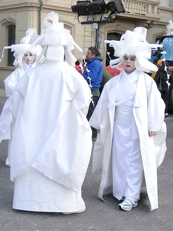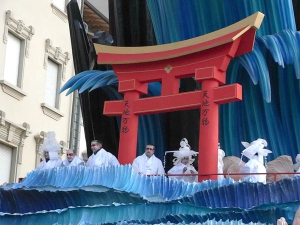このカーニバルに訪れたのは2012年2月なので、東日本大震災は起きた後、最初のカーニバル。そのためか、津波をモチーフにした山車も見られました。津波の上には鬼のようなものが見えます。津波の恐ろしさを表しているようでした。上の真ん中の写真の真ん中に白い着物を来た色眼鏡のイタリア人のオジサンが見えますが、日本の極道関係者のような凄みを醸し出していました。ここまでなりきっていてあっぱれ。右上の白装束の女性たちは、なんだかちょっと意味不明でしたが、イタリア人のイメージする日本人とはこんな感じなのでしょうか・・。