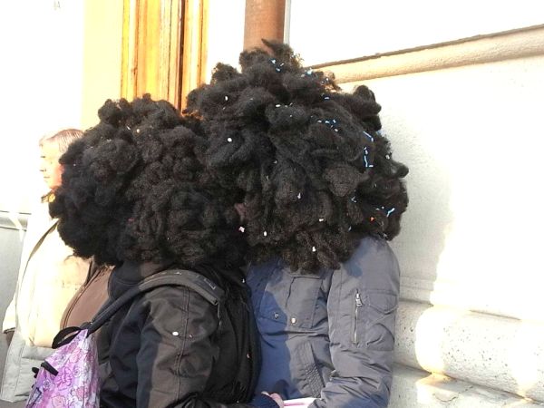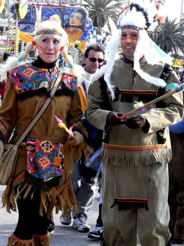 「恐竜に襲われる危機に見舞われているカップル」は、まさに映画のワンシーンのよう。ベストポジションでのカーニバル見学、なんともうらやましいです。ビッグなウィッグのカップルは、モフモフ頭がなんともかわいい。インディアン風のカップルは、二人ともノリノリで仮装していていっそう楽しそうでした!
