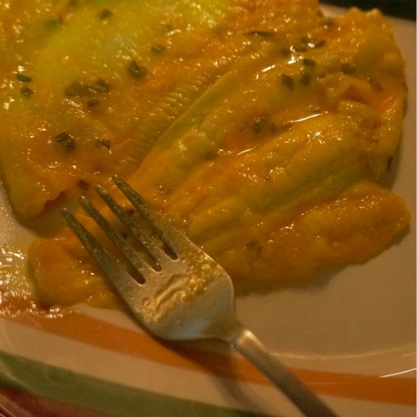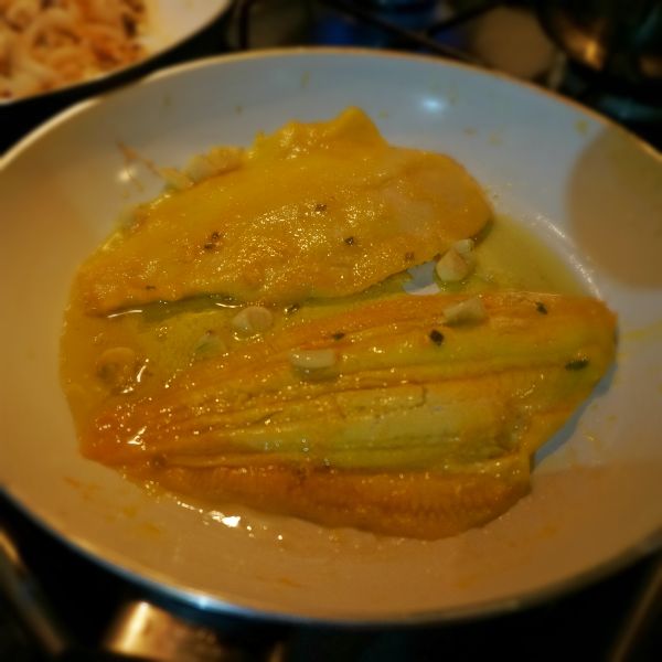 8. フライパンにオリーブオイルとにんにく数片を入れ火にかけます。そこへ小麦粉をまぶしたカレイのフィレを入れ、中火で片面づつ数分間焼きます。軽く塩コショウし、余ったオレンジソースも入れ、さらにゆっくりソースが煮詰まる程度に焼き上げます。