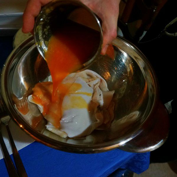 4. アカガレイに絞ったレッドオレンジの果汁をかけます。