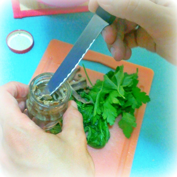 - 1.生バジリコ、生イタリアンパセリ、ケッパー(塩つきは洗い流しておく)とアンチョビフィレをまな板に置く。