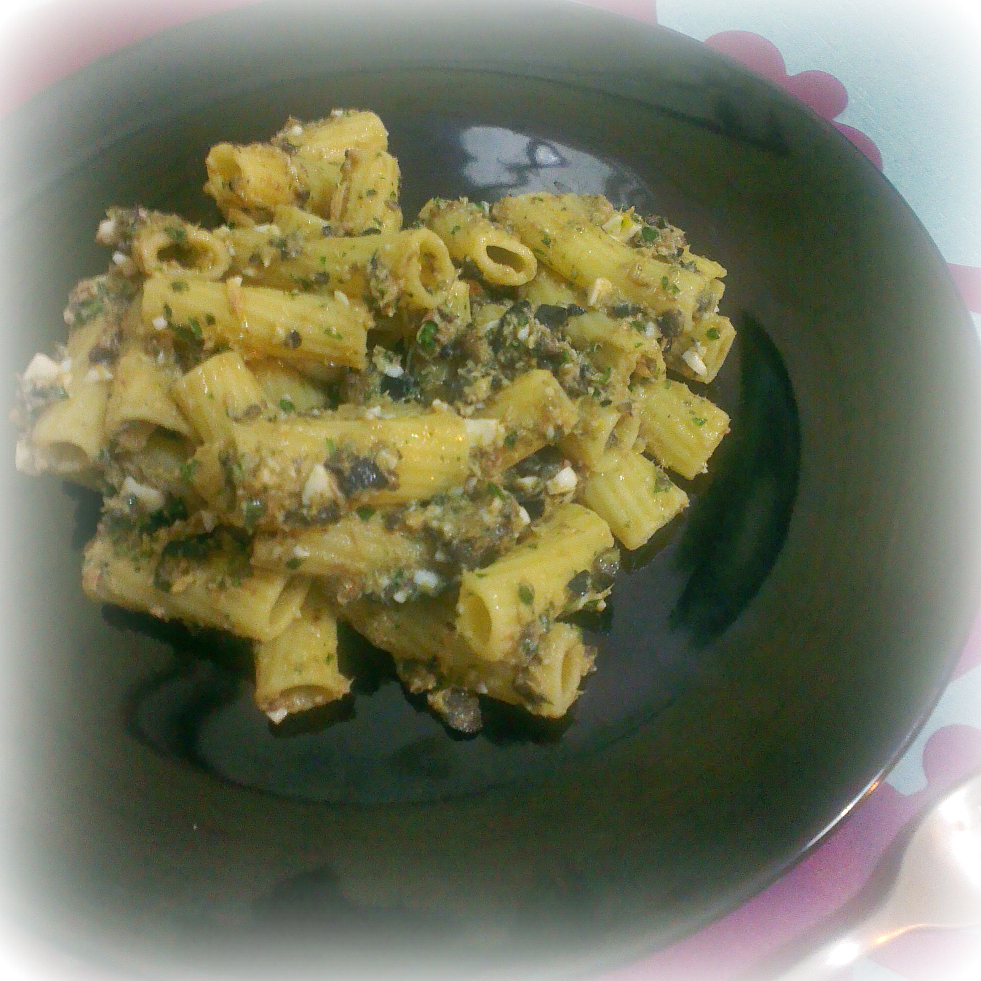 Pasta corta 200gr., 1 mazzetto di basilico, 1 mazzetto di prezzemolo, un cucchiaio di capperi sotto aceto, 3 filetti di acciughe sott’olio, 1 scatoletta di sardine, 150gr. di olive nere denocciolate (70gr. sgocciolate), un uovo sodo, olio extravergine di oliva, sale, pepe