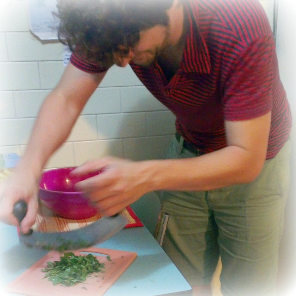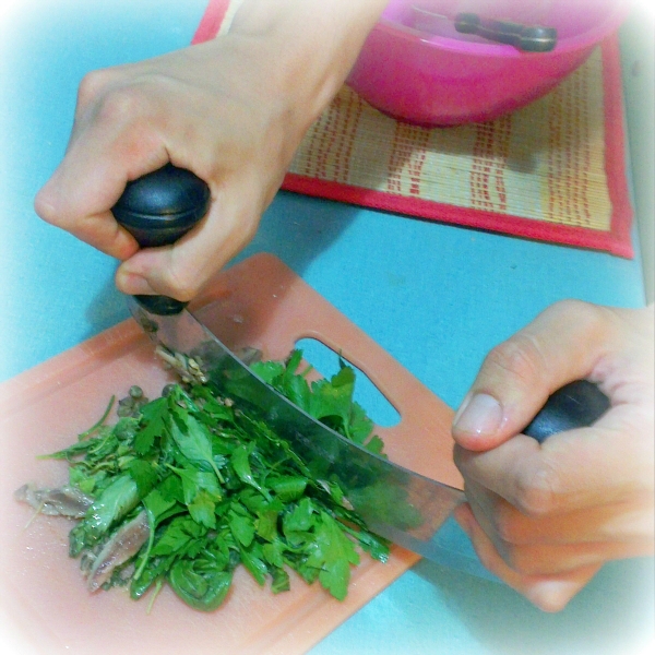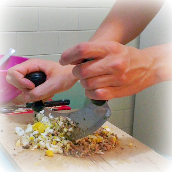 - 2.mezza luna(メッザ・ルーナ)という半月の形をした包丁で全てをチョップして細かくする。