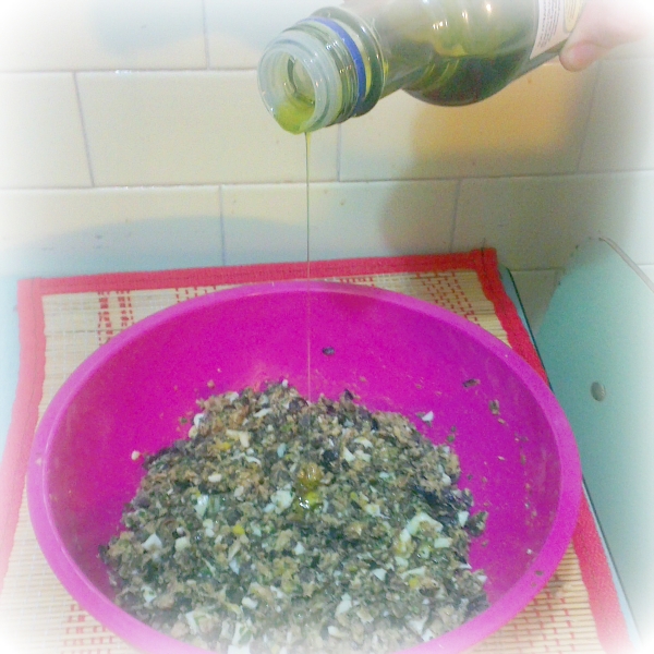 - 6.微塵切りにした材料を全てボウルに入れます。そこへ大さじ6杯のオリーブオイルを入れます。塩コショウも適量入れます。