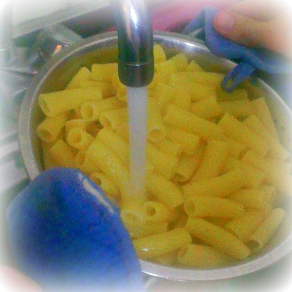 - 7.アルデンテに茹でたパスタを流水で冷やします。パスタは、リガトーニ、ペンネといった、短めで穴の開いたパスタならどれでもOK。細長いスパゲッティはNGです。