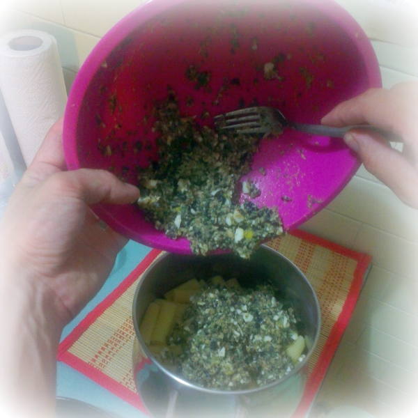 - 8.冷やしたパスタに、ソースを加え、よくかき混ぜます。