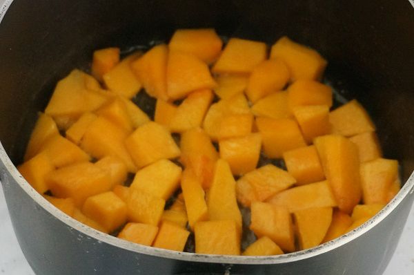 - 1.かぼちゃを一口サイズに四角く切り、柔らかくなるまで、少しのバター(分量外)で15分ほど炒めるか、15分ほどオーブンに入れます。