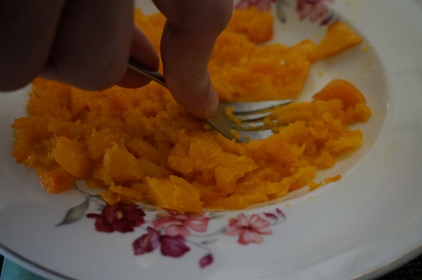 - 3.炒めたかぼちゃをフォークで粗く潰します。ちょっと力が要りますよ!