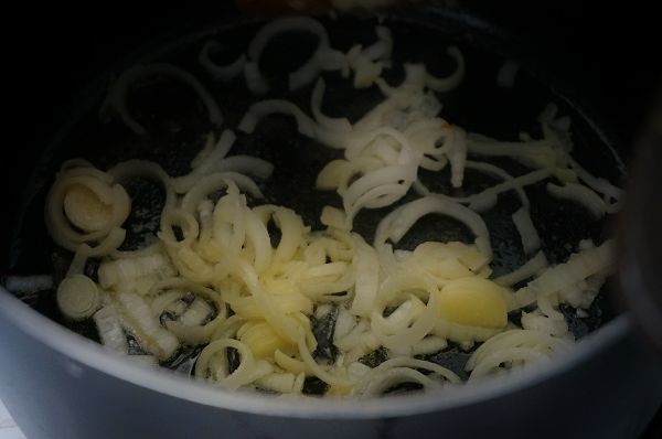 - 5.かぼちゃを取り出した後の鍋にねぎを入れて透き通る程度に炒めます。