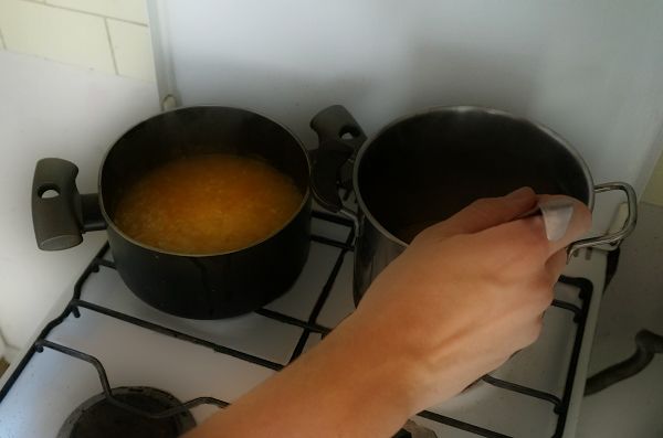 La ricetta tradizionale prevede l’uso della sola zucca gialla in un soffritto con poca cipolla, ma i porri ci stanno benissimo.