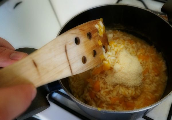 La ricetta tradizionale prevede l’uso della sola zucca gialla in un soffritto con poca cipolla, ma i porri ci stanno benissimo.
