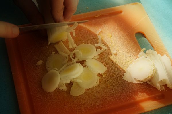 - 4.ねぎを洗って薄く刻みます。この時、緑の固い部分は2のブロードに入れてください、いいダシが出ます。