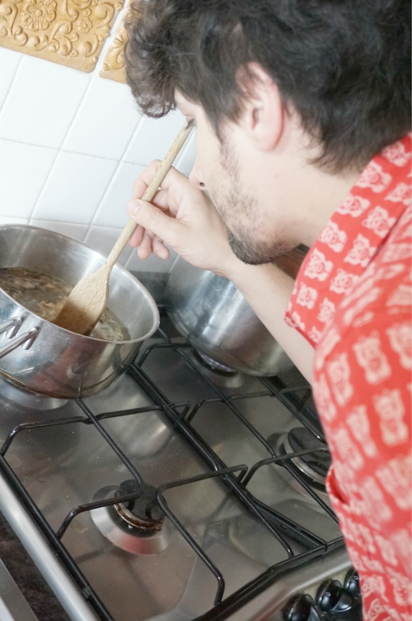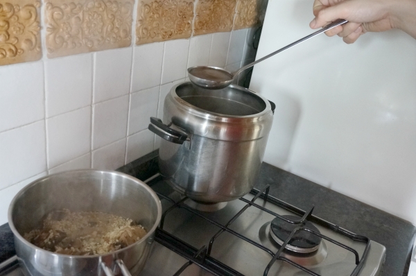 11.沸騰させておいた野菜ブイヨン(ブロード)を少しづつ加えていきます。